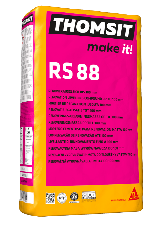 Universeller, schneller, kunststoffmodifizierter zementärer Ausgleich für die Erstellung normgerechter Untergründe in Schichtdicken von 1 – 100 mm in einem Arbeitsgang. Standfest bis geschmeidig einstellbar durch entsprechende Wasserdosierung. Thomsit RS 88 eignet sich für das: